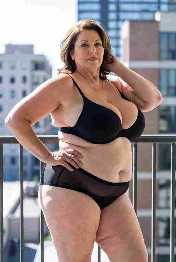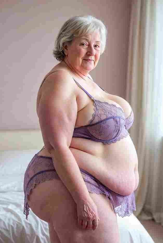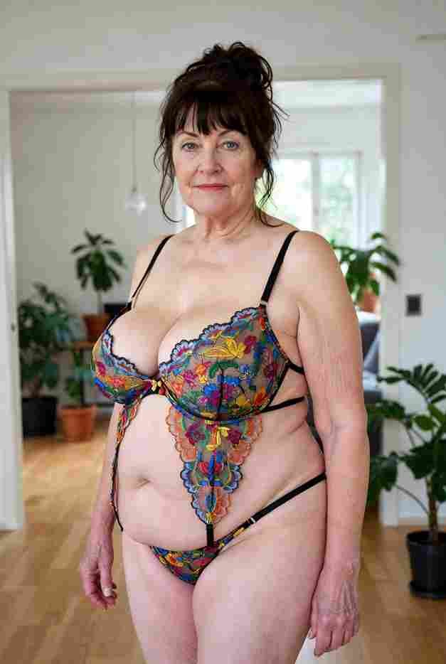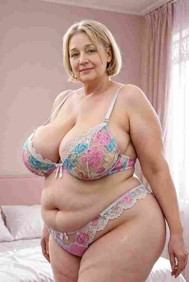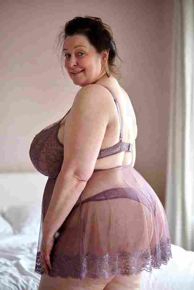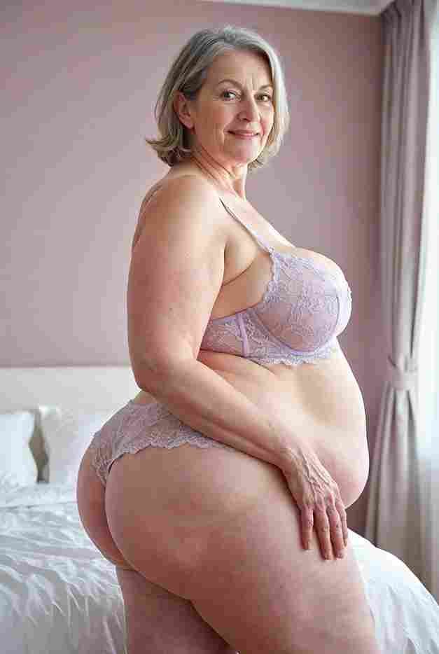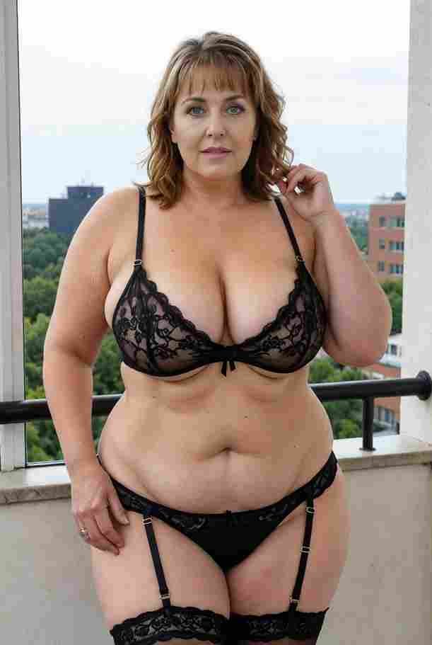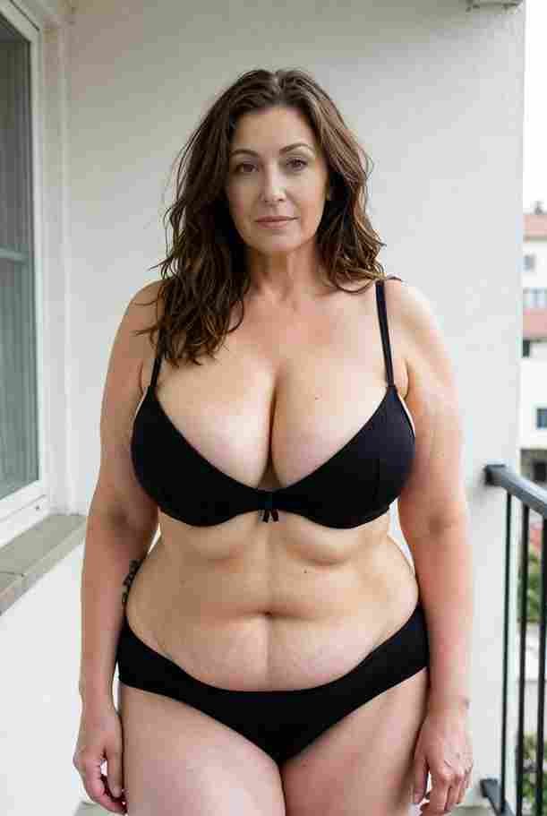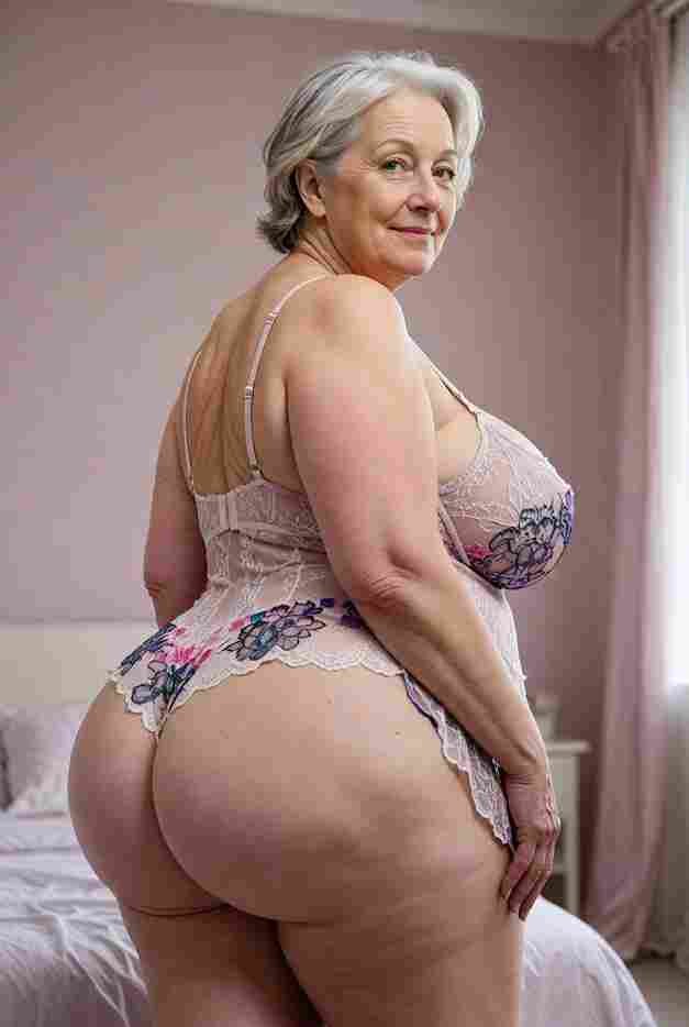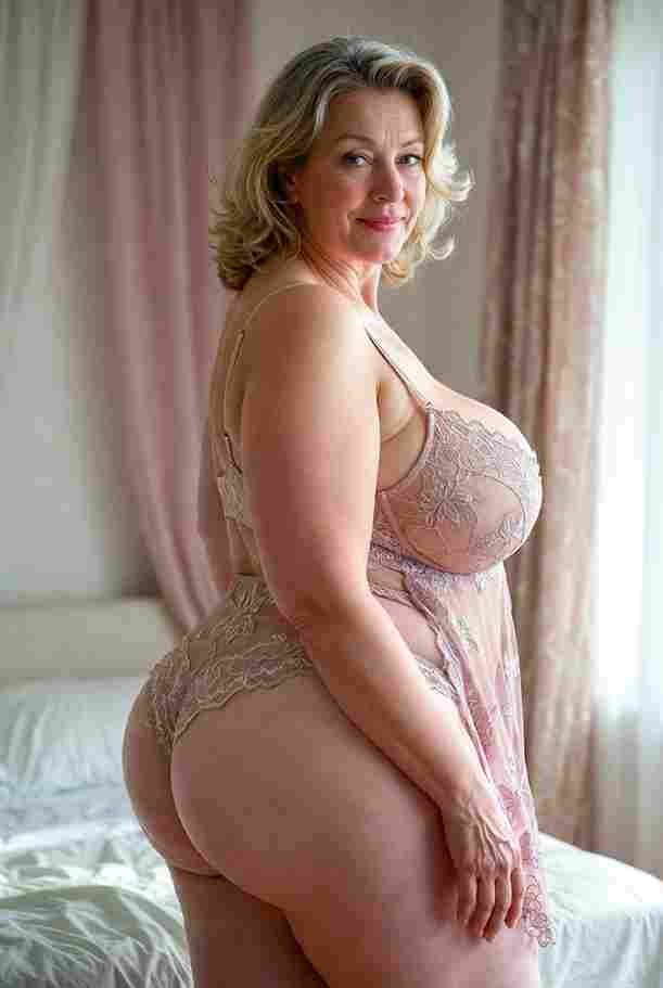 She’s wearing a sheer black lace teddy that clings loosely around her heavy breasts, her hard nipples clearly visible through the thin fabric. Lying on her back on the bed, legs spread wide, knees bent high. One hand grips a thick black dildo, slowly sliding it all the way in and pulling it out again, each thrust producing wet, sucking sounds. Her other hand presses two fingers hard against her clit, rubbing fast in tight circles. Head thrown back, eyes squeezed shut, mouth open in a silent moan—suddenly her whole body jerks, legs trembling and straightening out. A long, drawn-out “Aaaahhh…” escapes as she squirts hard, thin streams splashing across the bedsheets, soaking her stomach and dripping down her thighs.