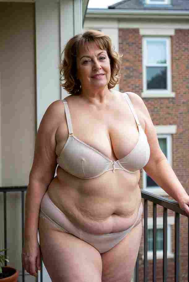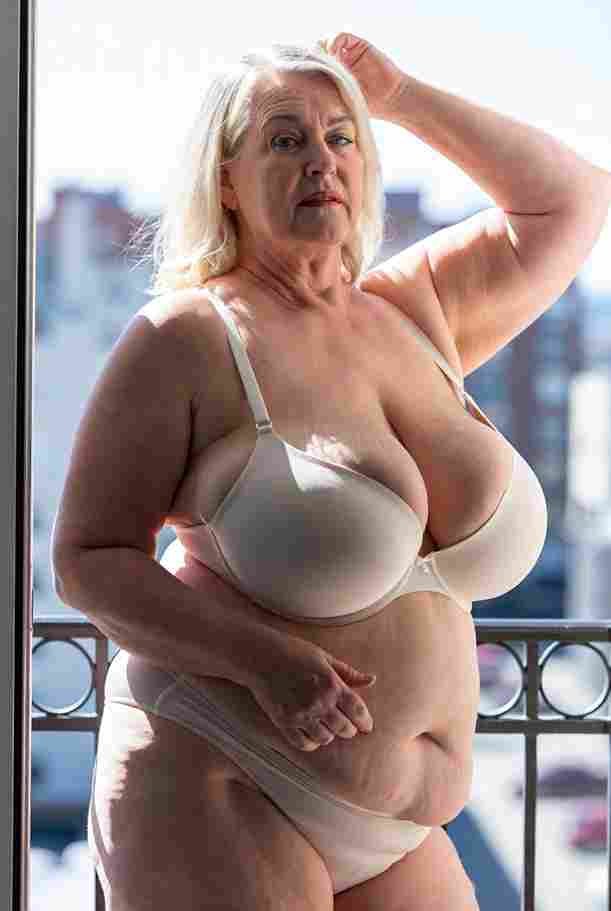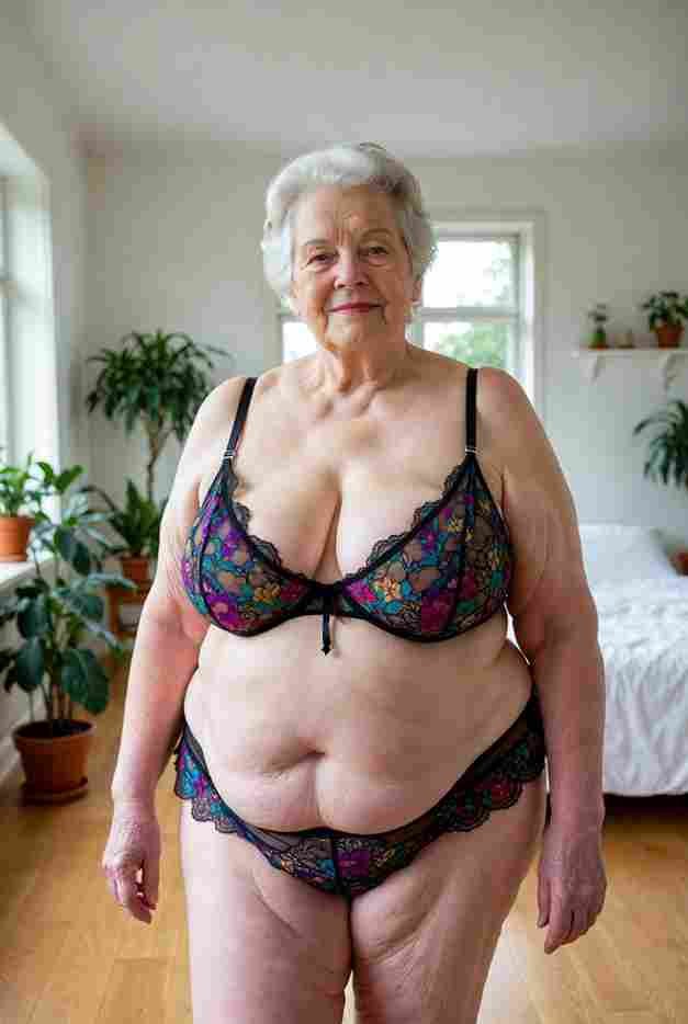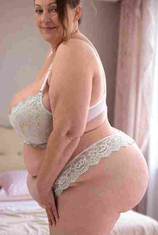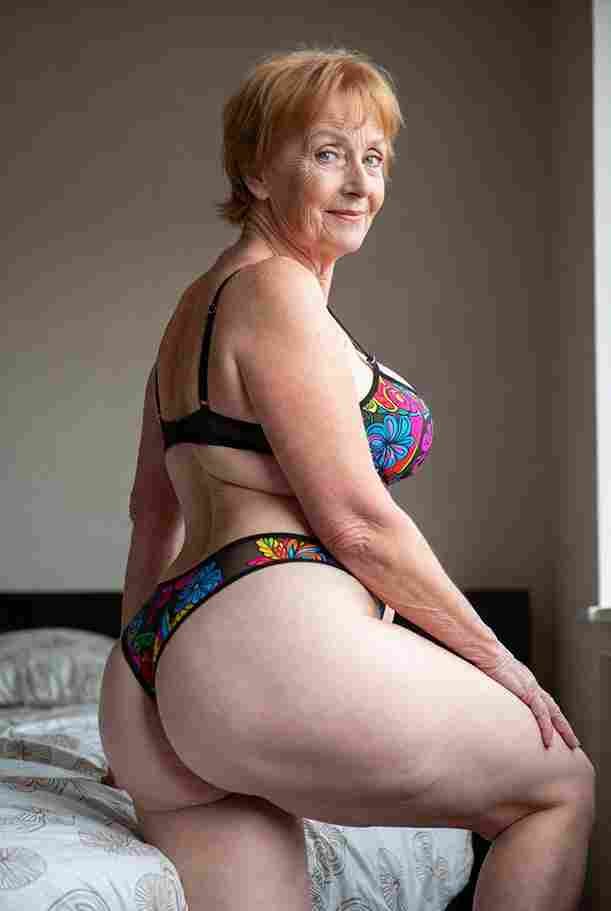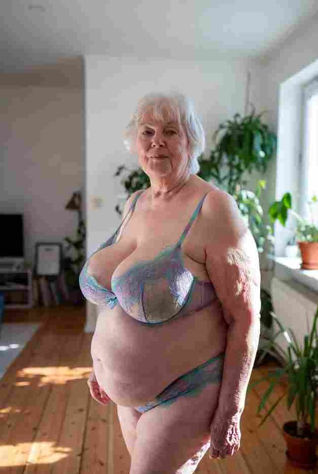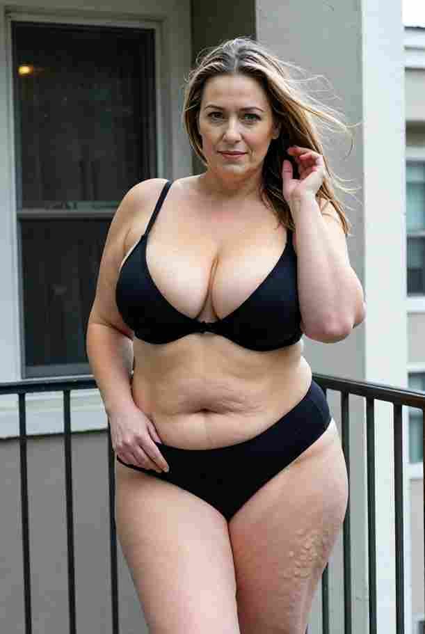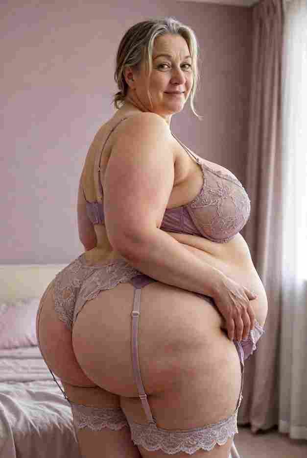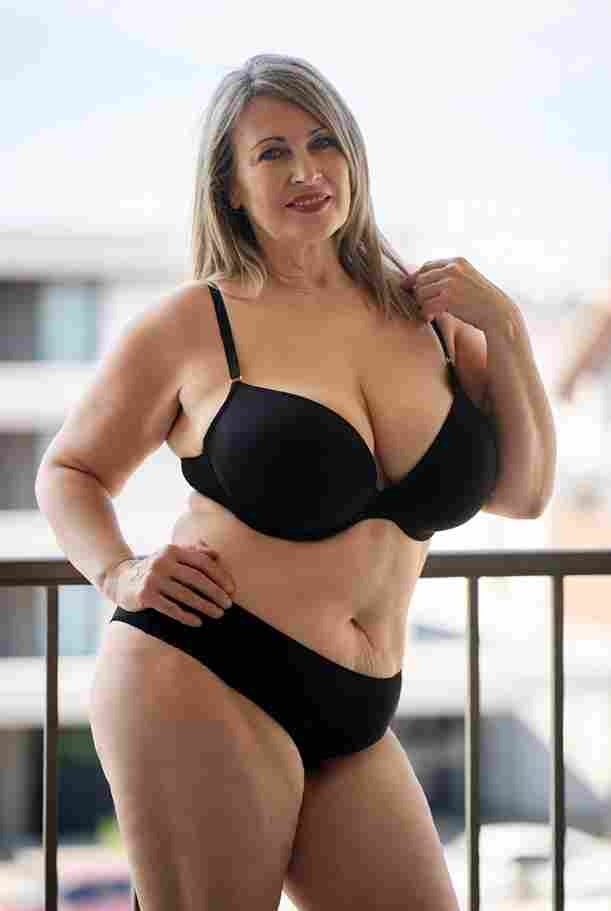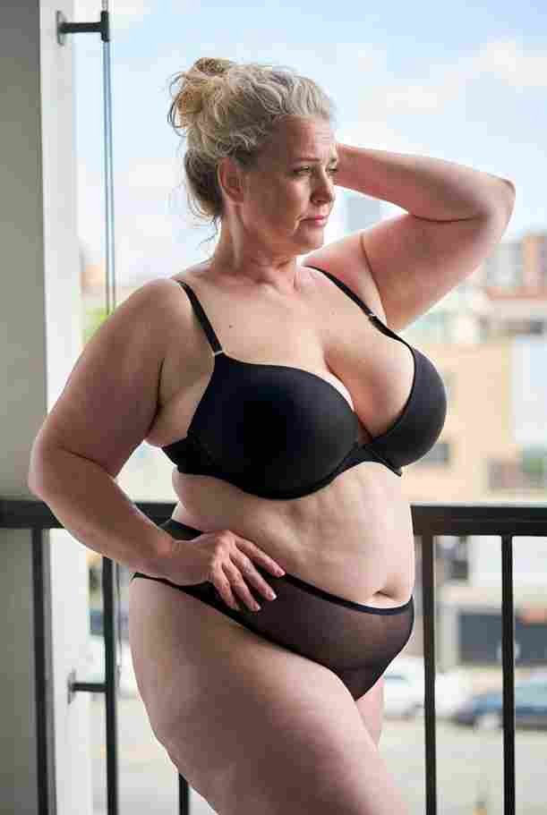 She’s wearing a sheer black lace teddy that clings loosely around her heavy breasts, her hard nipples clearly visible through the thin fabric. Lying on her back on the bed, legs spread wide, knees bent high. One hand grips a thick black dildo, slowly sliding it all the way in and pulling it out again, each thrust producing wet, sucking sounds. Her other hand presses two fingers hard against her clit, rubbing fast in tight circles. Head thrown back, eyes squeezed shut, mouth open in a silent moan—suddenly her whole body jerks, legs trembling and straightening out. A long, drawn-out “Aaaahhh…” escapes as she squirts hard, thin streams splashing across the bedsheets, soaking her stomach and dripping down her thighs.