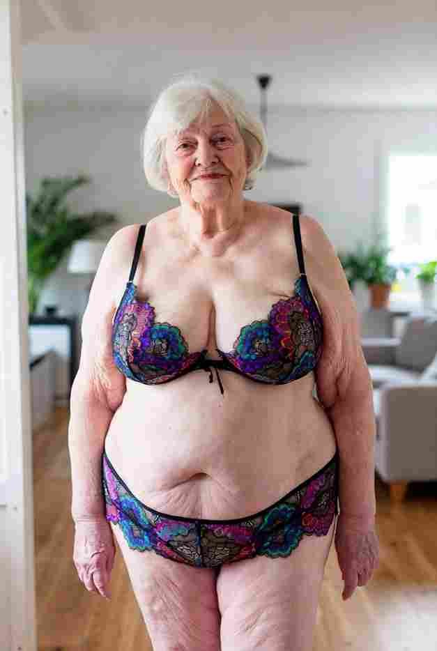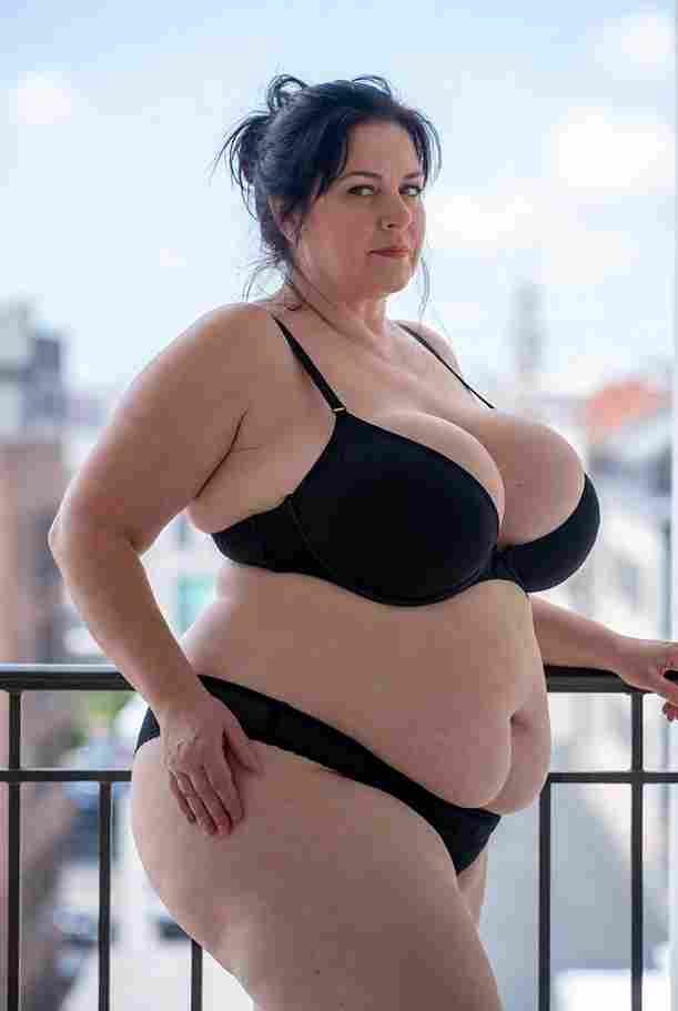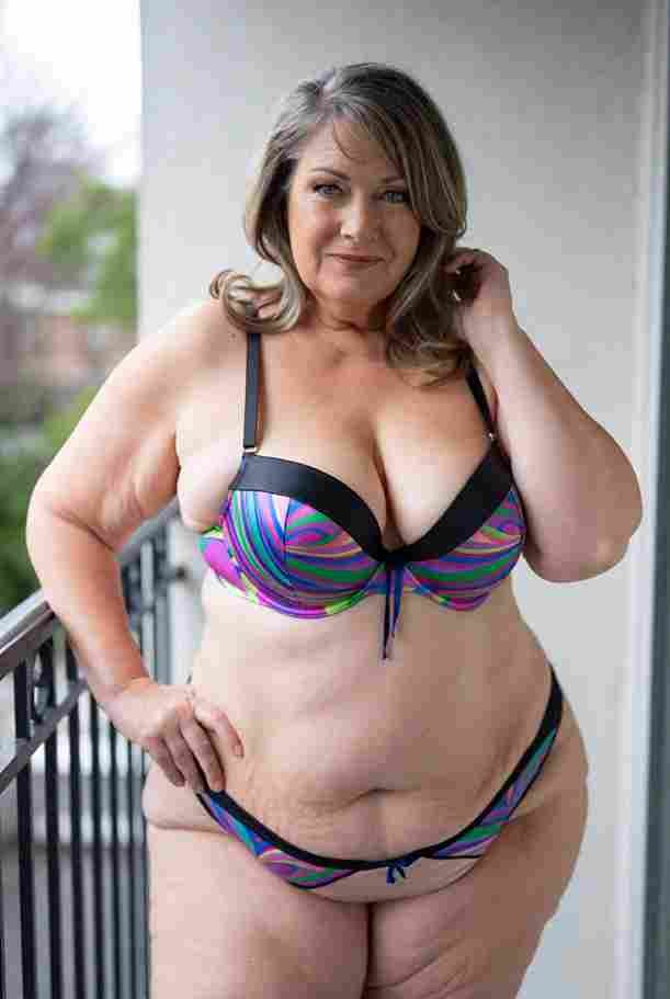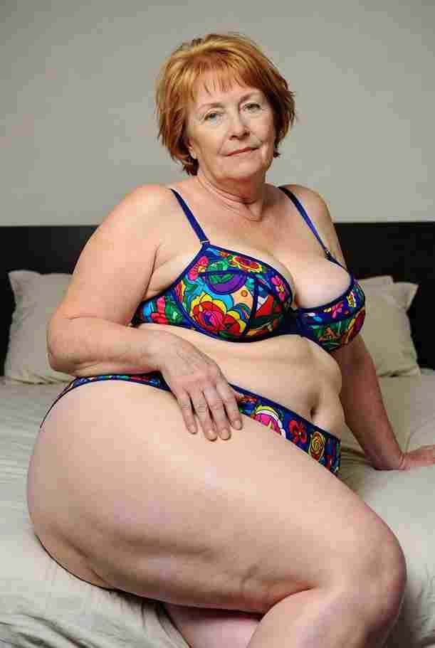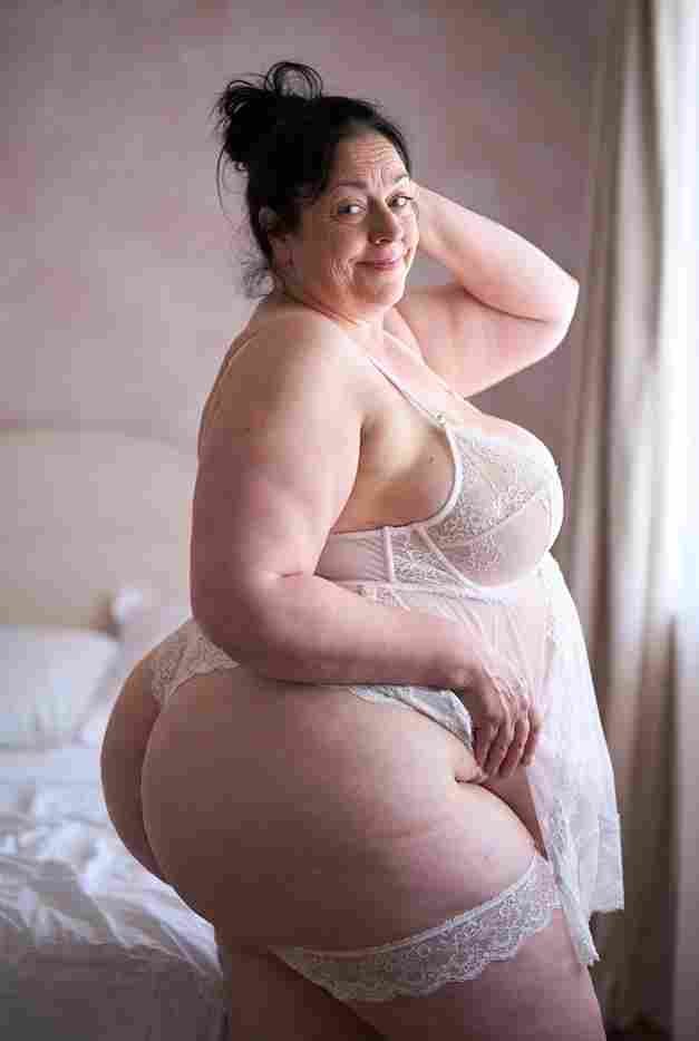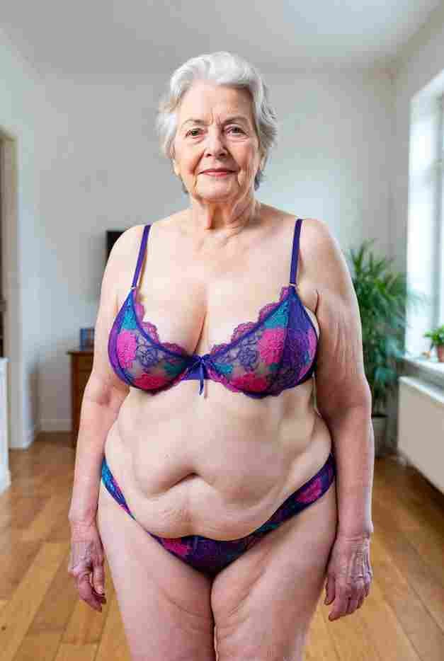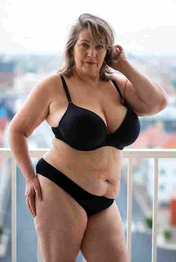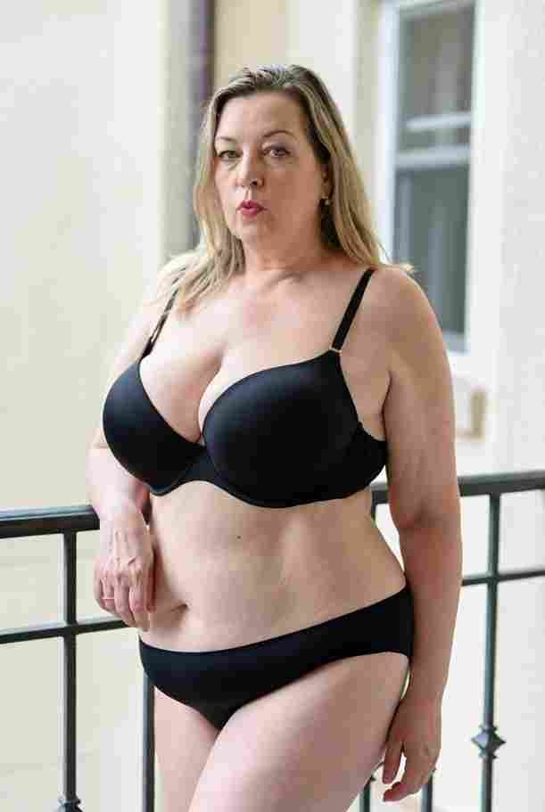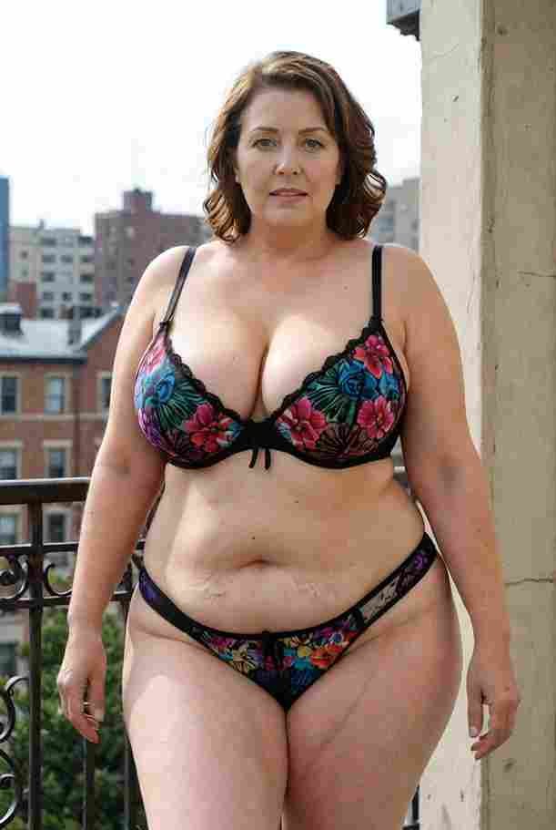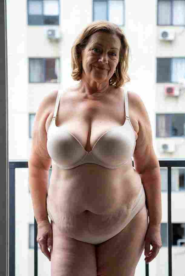 She’s wearing a sheer black lace teddy that clings loosely around her heavy breasts, her hard nipples clearly visible through the thin fabric. Lying on her back on the bed, legs spread wide, knees bent high. One hand grips a thick black dildo, slowly sliding it all the way in and pulling it out again, each thrust producing wet, sucking sounds. Her other hand presses two fingers hard against her clit, rubbing fast in tight circles. Head thrown back, eyes squeezed shut, mouth open in a silent moan—suddenly her whole body jerks, legs trembling and straightening out. A long, drawn-out “Aaaahhh…” escapes as she squirts hard, thin streams splashing across the bedsheets, soaking her stomach and dripping down her thighs.