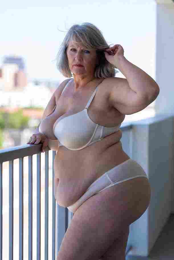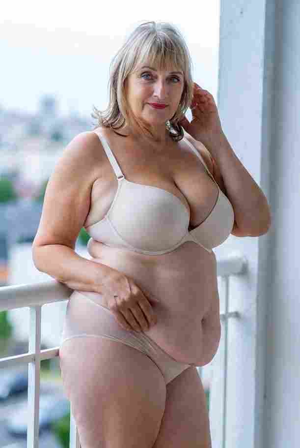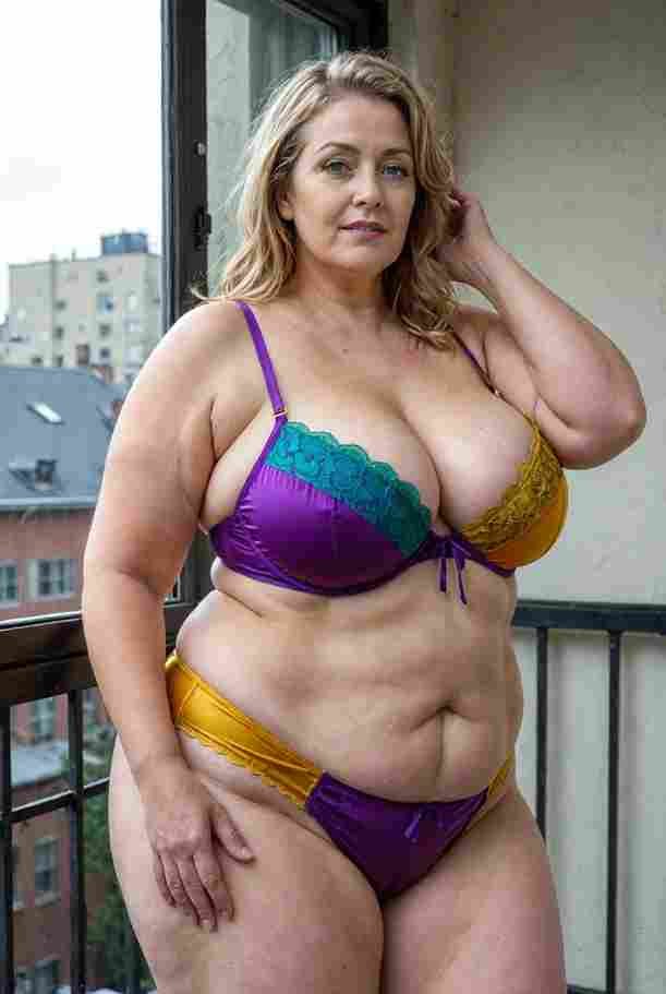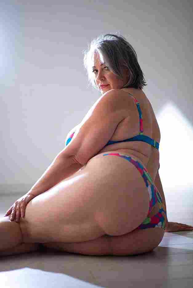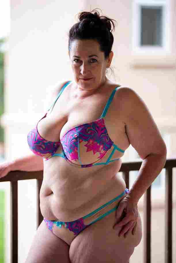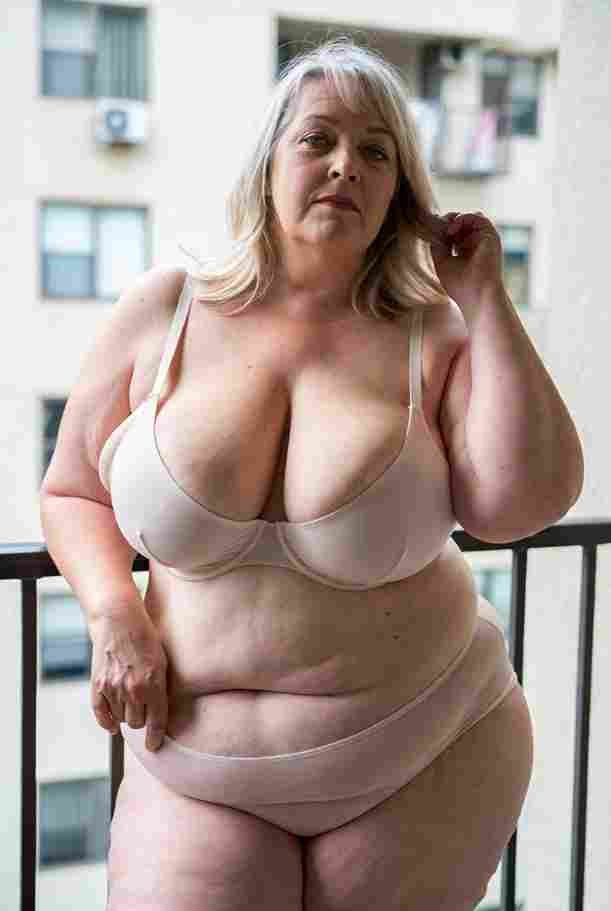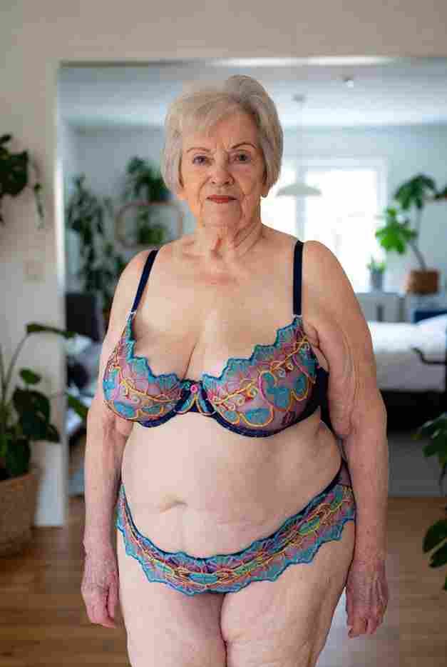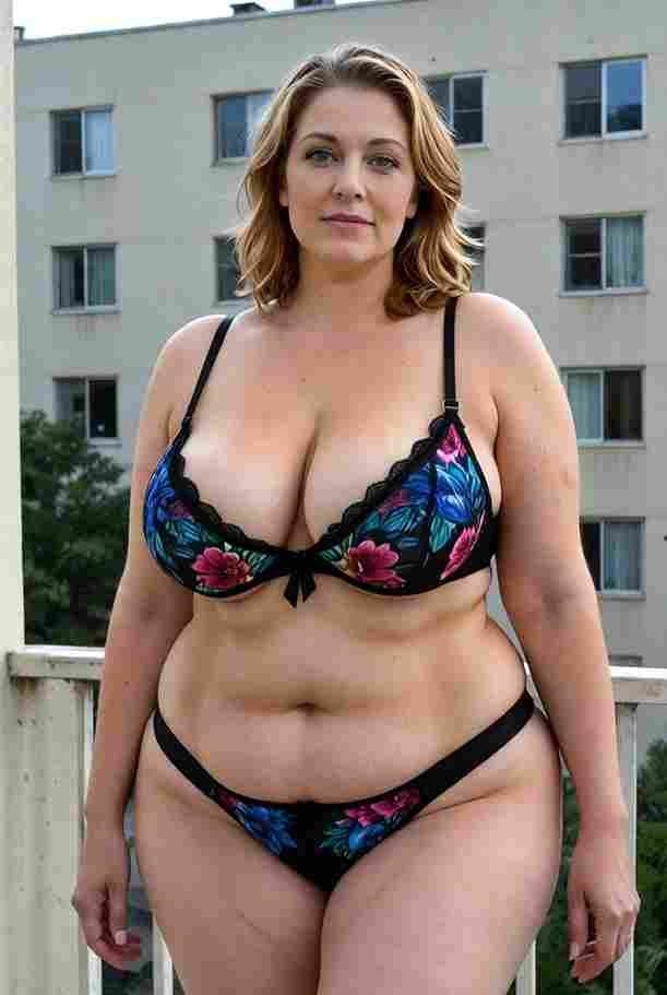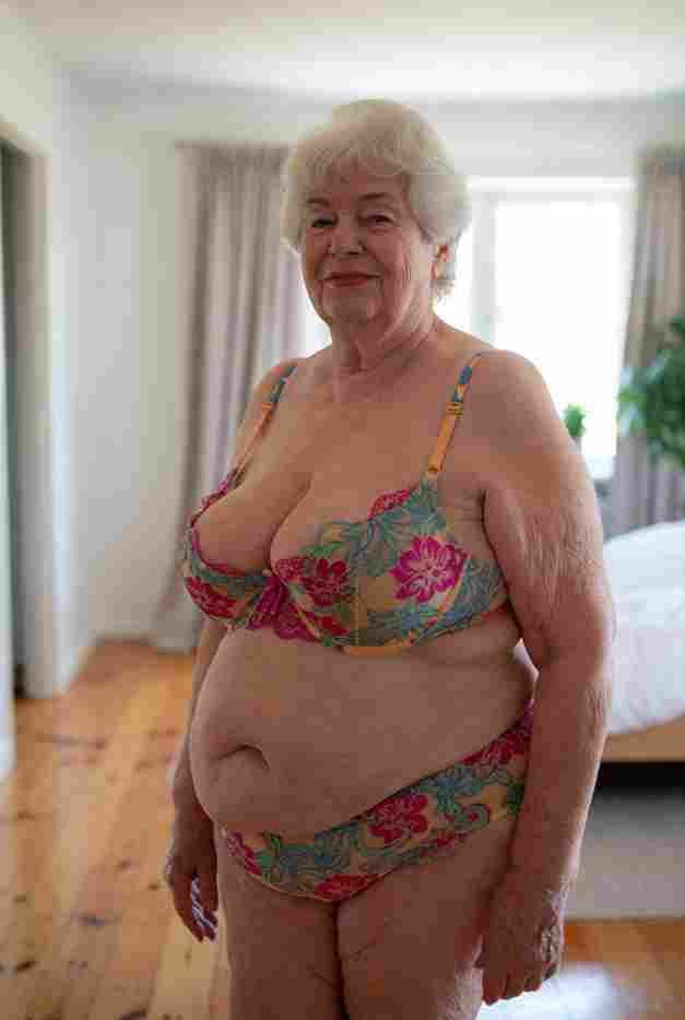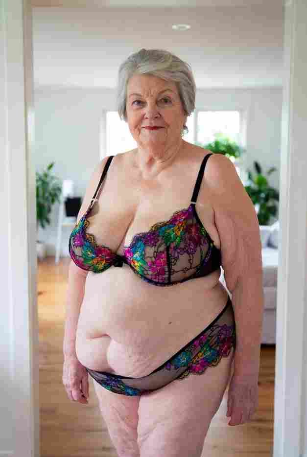 She’s wearing a sheer black lace teddy that clings loosely around her heavy breasts, her hard nipples clearly visible through the thin fabric. Lying on her back on the bed, legs spread wide, knees bent high. One hand grips a thick black dildo, slowly sliding it all the way in and pulling it out again, each thrust producing wet, sucking sounds. Her other hand presses two fingers hard against her clit, rubbing fast in tight circles. Head thrown back, eyes squeezed shut, mouth open in a silent moan—suddenly her whole body jerks, legs trembling and straightening out. A long, drawn-out “Aaaahhh…” escapes as she squirts hard, thin streams splashing across the bedsheets, soaking her stomach and dripping down her thighs.