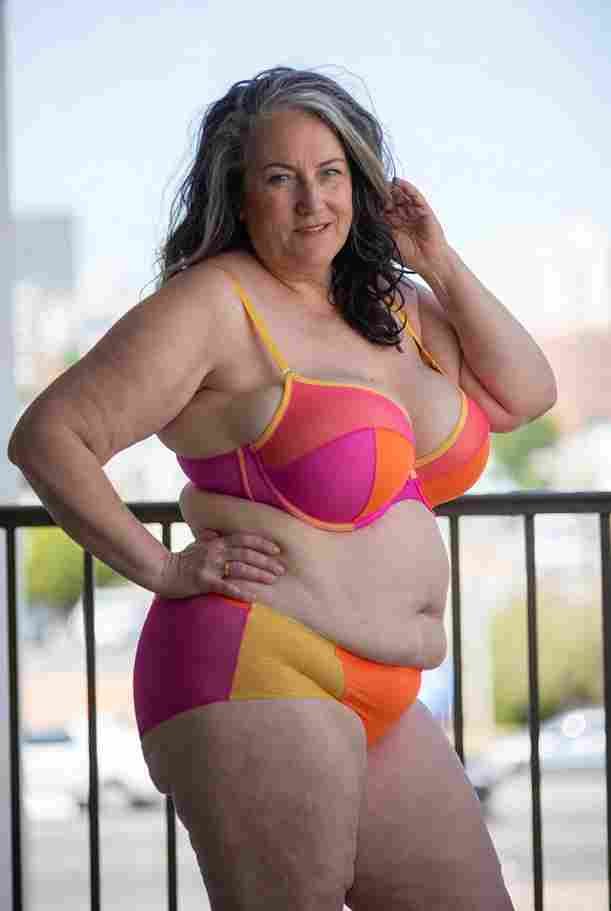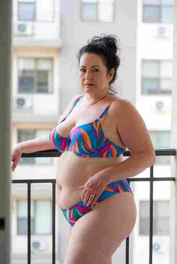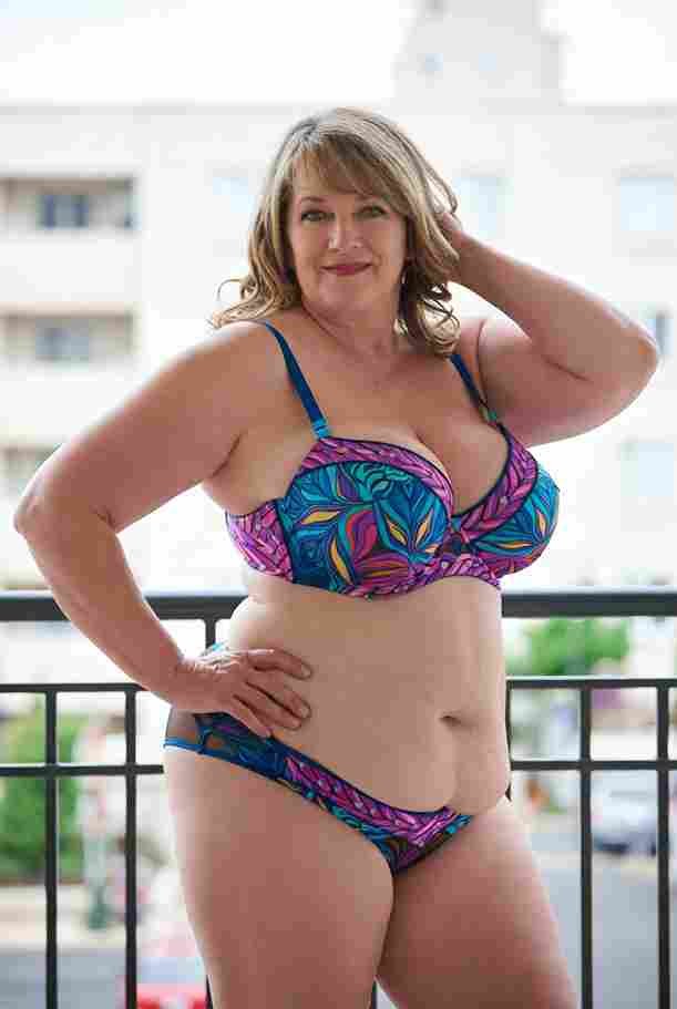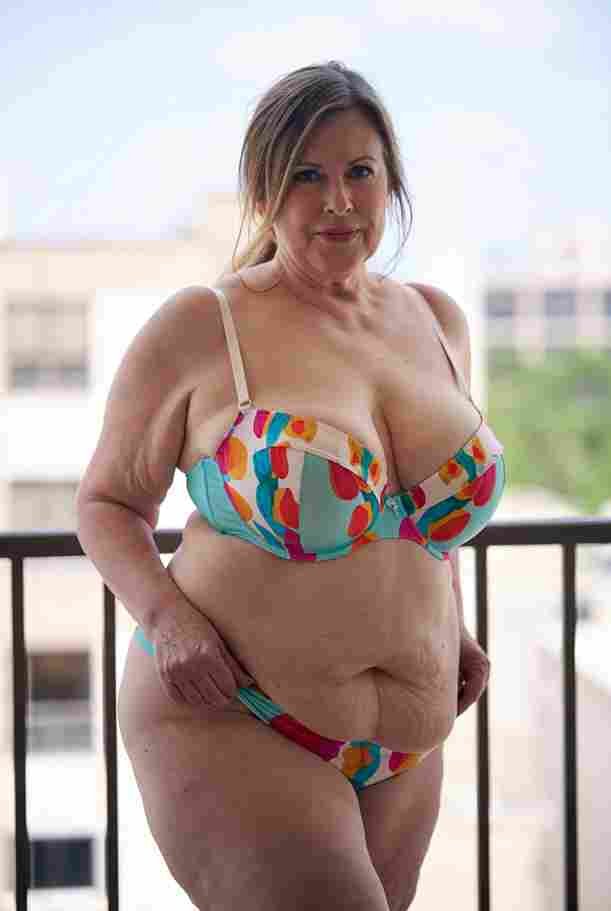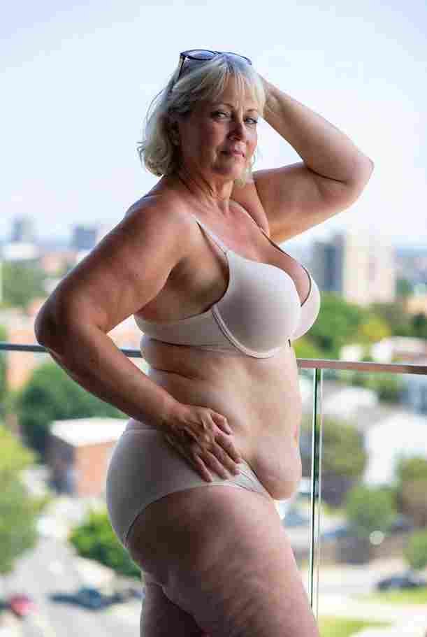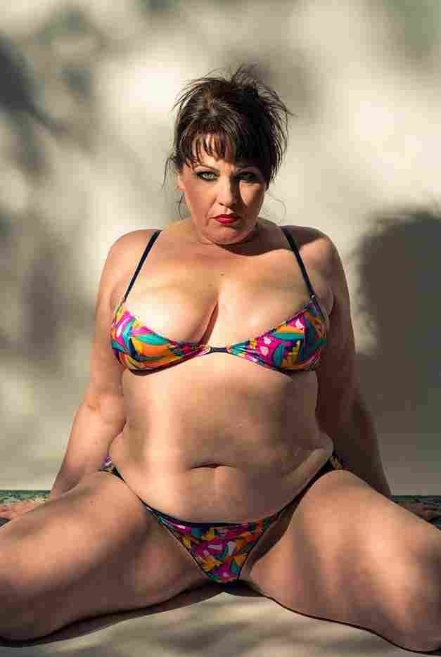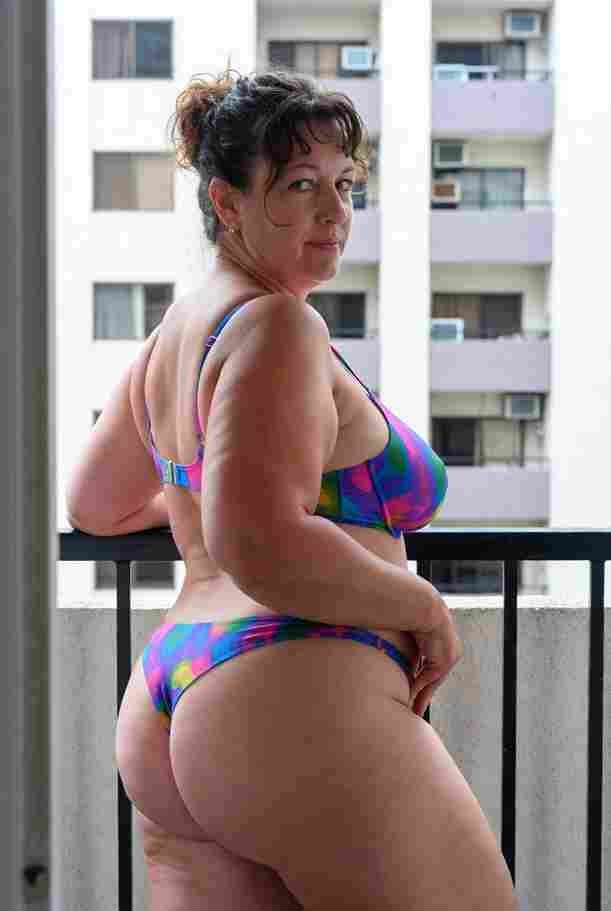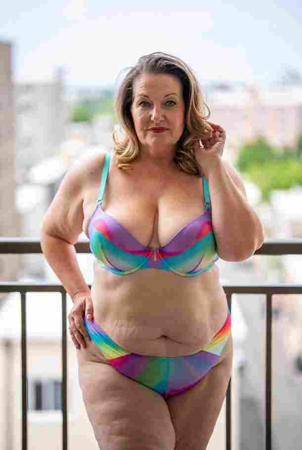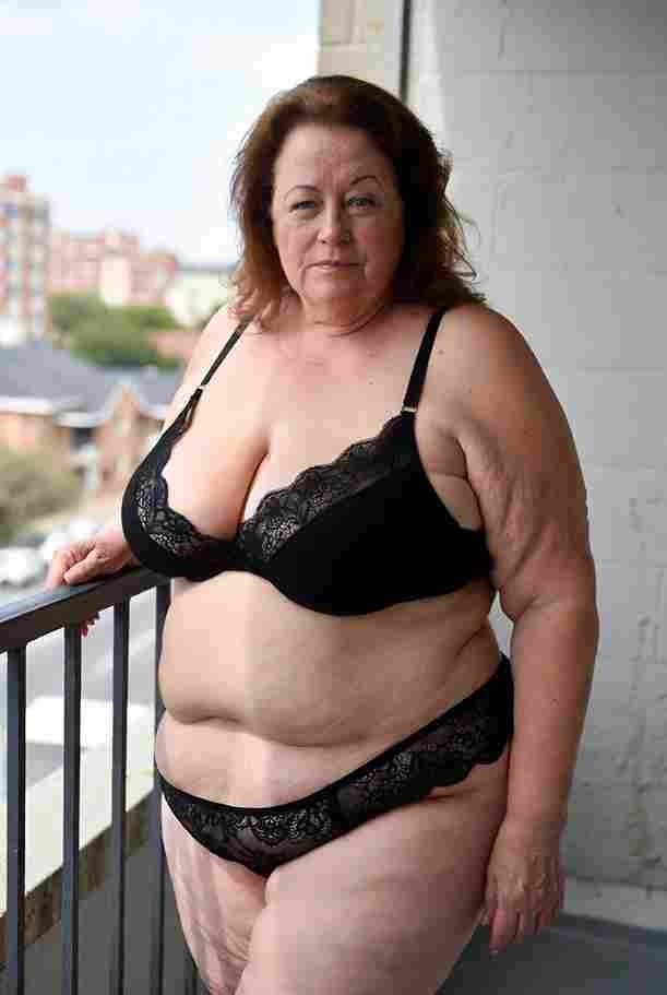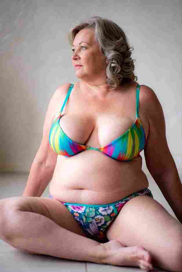 She’s wearing a sheer black lace teddy that clings loosely around her heavy breasts, her hard nipples clearly visible through the thin fabric. Lying on her back on the bed, legs spread wide, knees bent high. One hand grips a thick black dildo, slowly sliding it all the way in and pulling it out again, each thrust producing wet, sucking sounds. Her other hand presses two fingers hard against her clit, rubbing fast in tight circles. Head thrown back, eyes squeezed shut, mouth open in a silent moan—suddenly her whole body jerks, legs trembling and straightening out. A long, drawn-out “Aaaahhh…” escapes as she squirts hard, thin streams splashing across the bedsheets, soaking her stomach and dripping down her thighs.